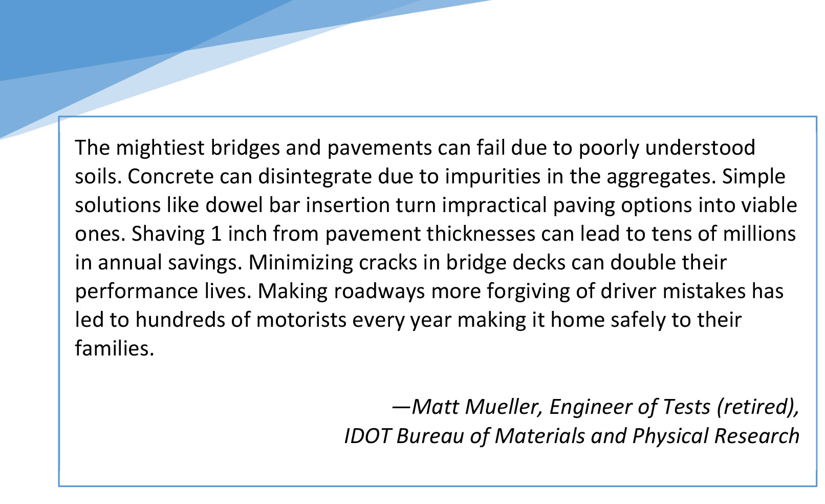 But all research projects, he adds, provide value and benefits: “Every time we found an answer that could help a materials supplier, an industry, a fellow employee, or IDOT in its goal to deliver the most cost-effective product, I felt there was value.”