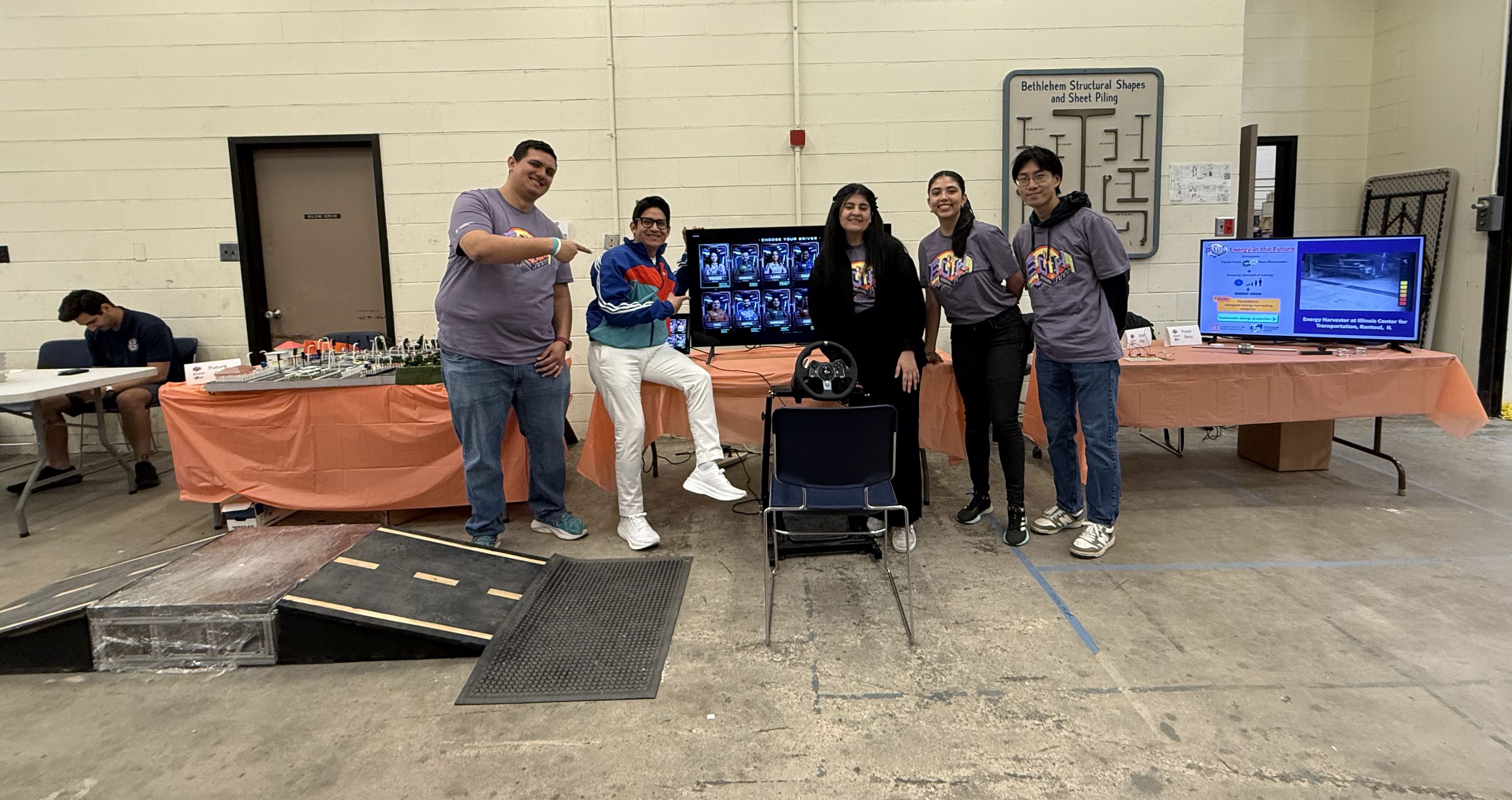 The American Society of Civil Engineers Transportation and Development Institute graduate student organization, in collaboration with Illinois Center for Transportation, presented an interactive five-station exhibit focused on pavement energy harvesting in transportation systems—an emerging approach that captures and converts energy generated by traffic loads, vibrations, or temperature differences within roadways into usable electricity for infrastructure applications such as lighting, sensors, and smart transportation systems.