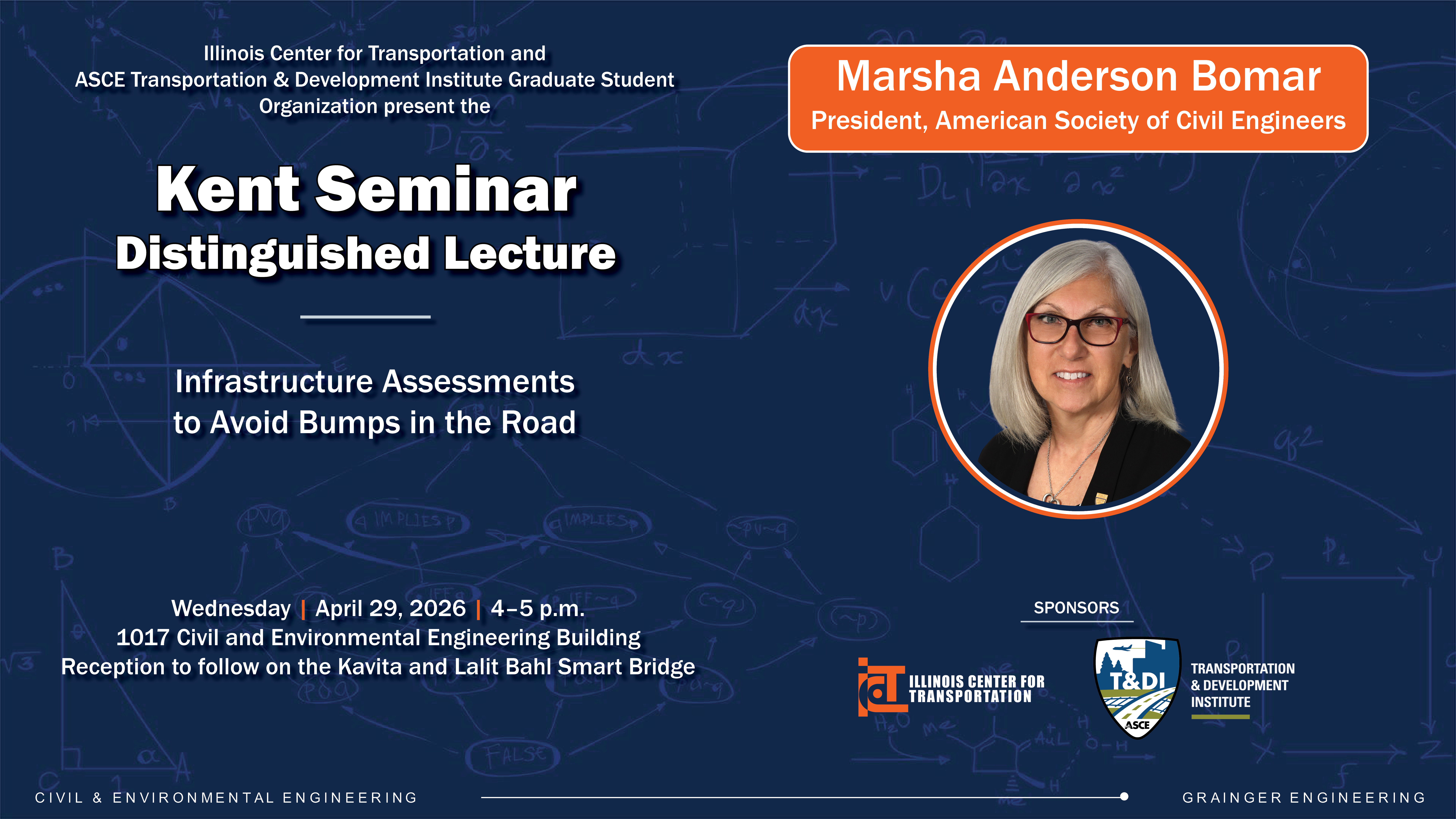 Illinois Center for Transportation is proud to present the Kent Seminar Distinguished Lecture Wednesday, April 29. The lecture will begin at 4 p.m. with a reception to follow at 5 p.m. (CT).