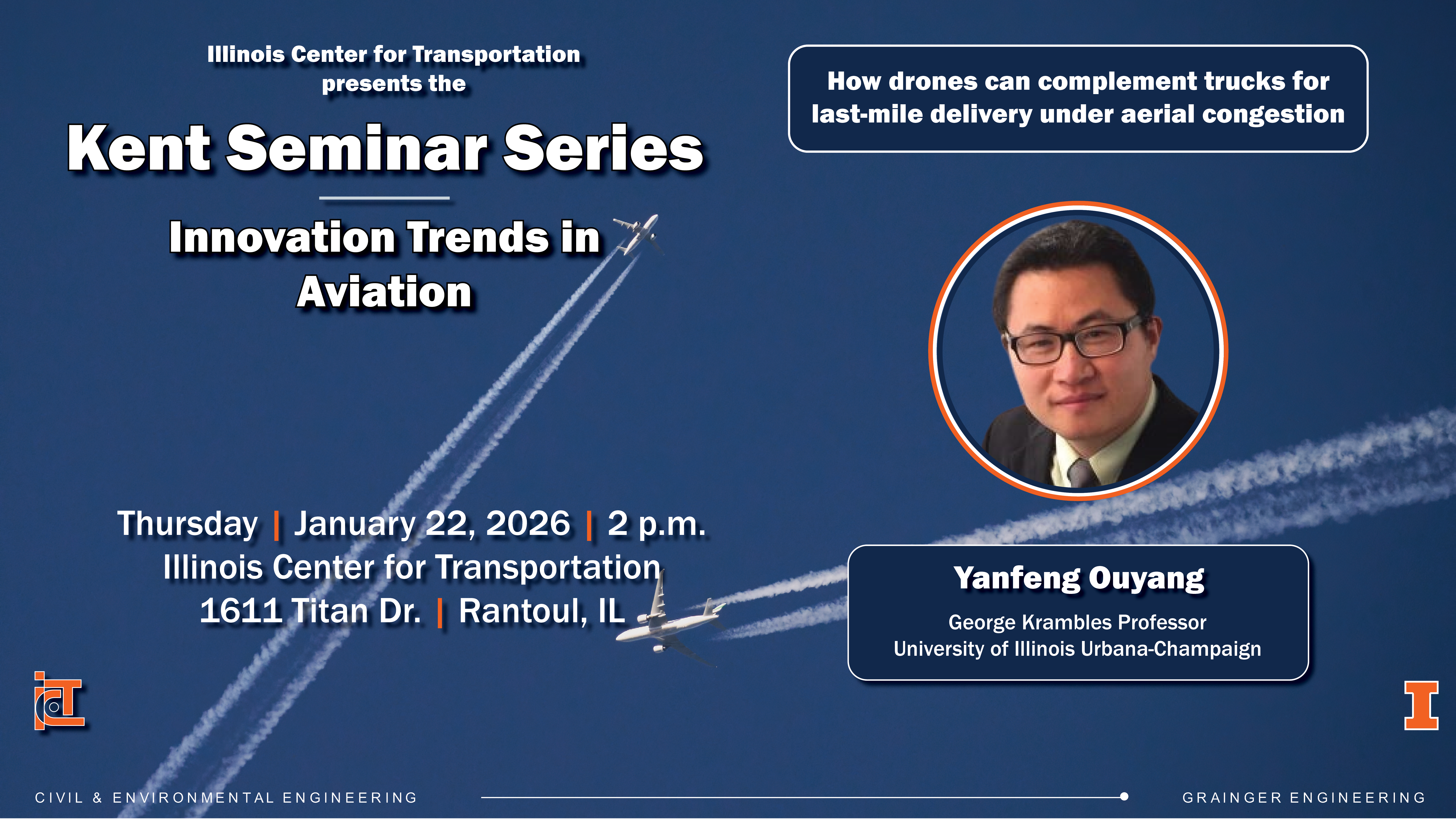 Join Yanfeng Ouyang of the University of Illinois Urbana-Champaign as he presents in person at the Spring 2026 Kent Seminar Series Thursday, January 22, from 2-3 p.m. (CT).